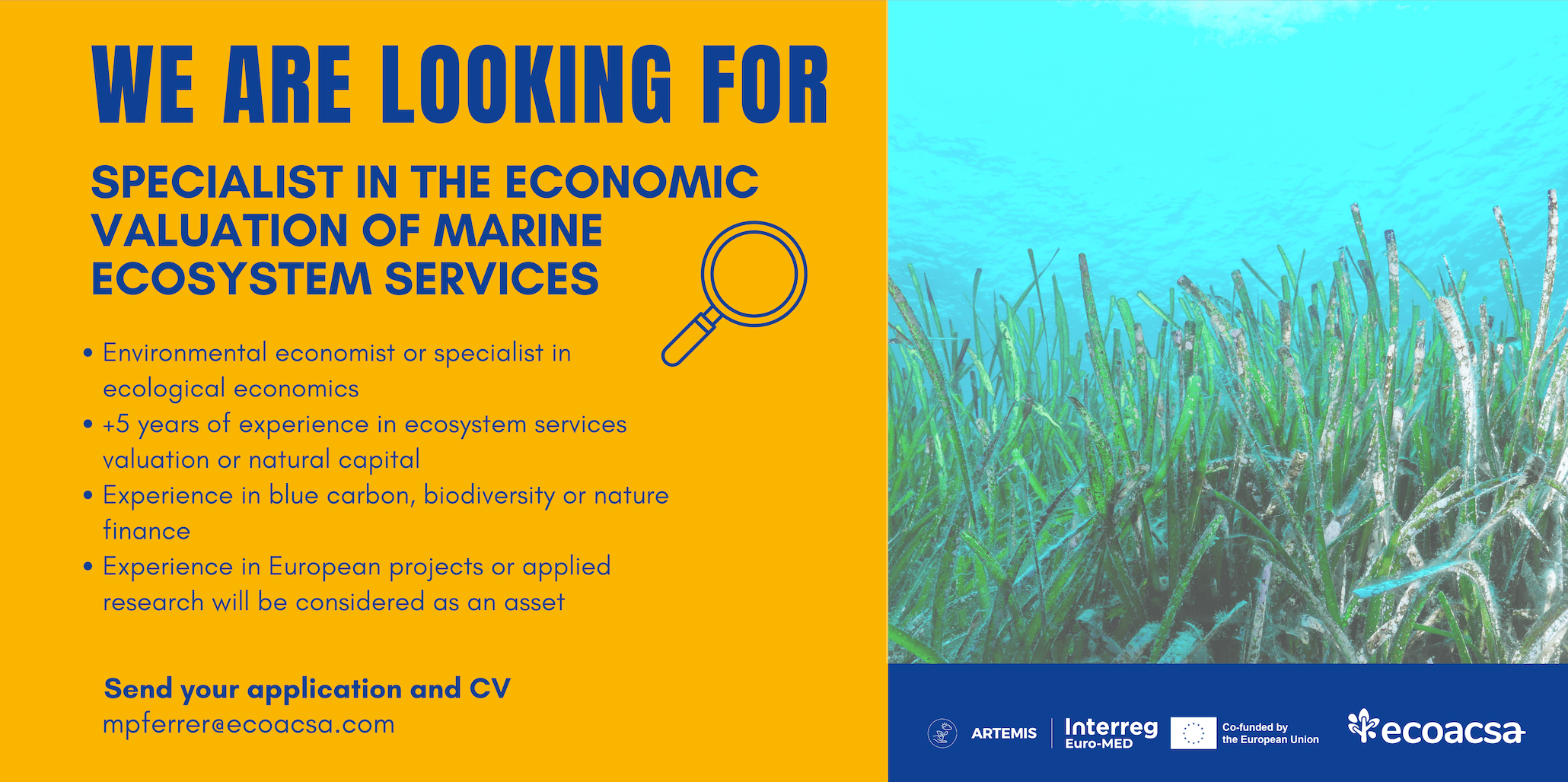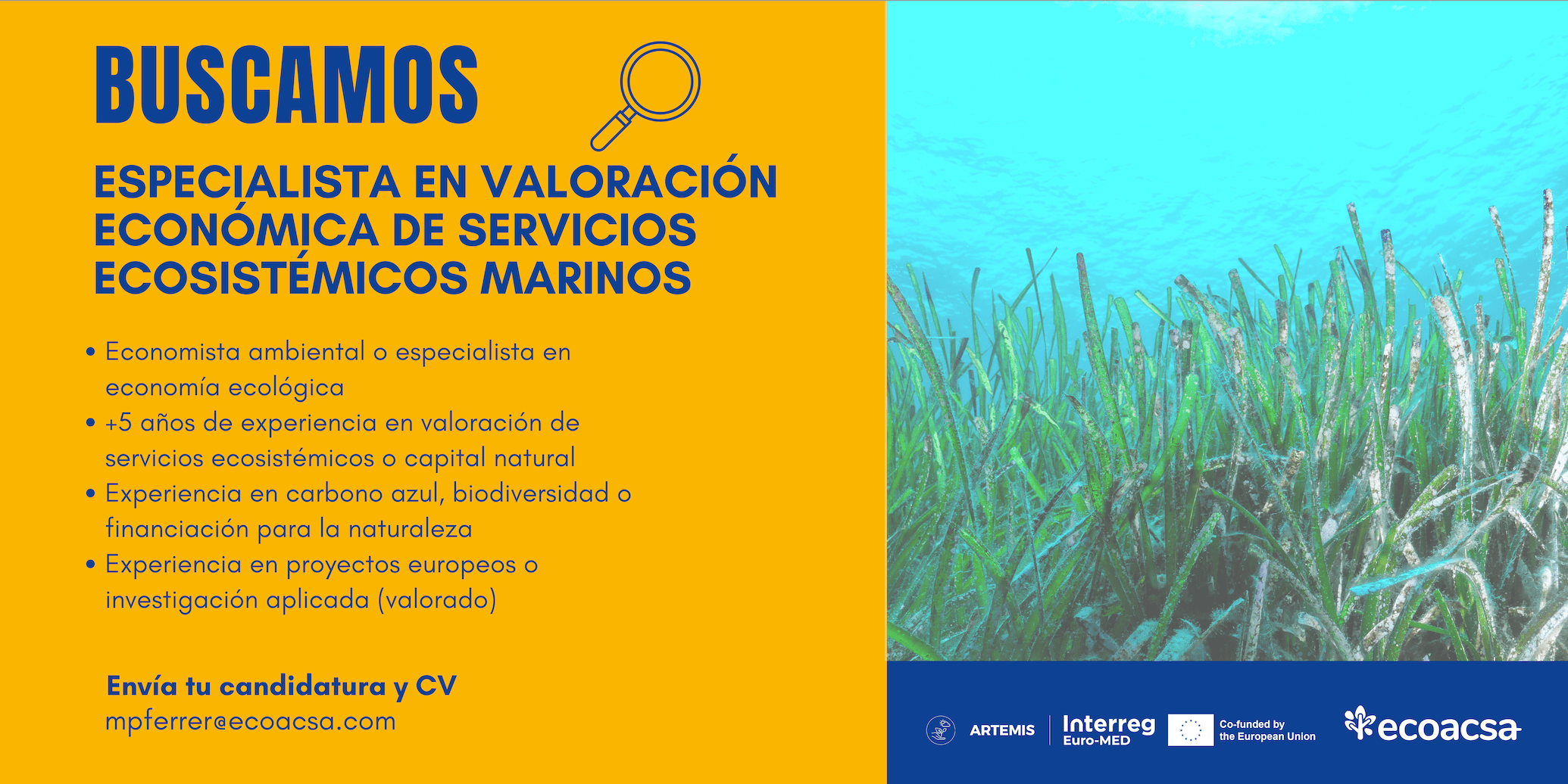 Ecoacsa Reserva de Biodiversidad has launched a selection process to contract a company or professional specialised in the economic valuation of marine ecosystem services for nature, within the framework of the ARTEMIS European project, funded by the Interreg Interreg Euro-MED.